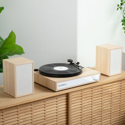 The Victrola Harmony turntable system blends classic mid-century design with premium stereo sound for a rich, immersive listening experience. Featuring a full-size, belt-driven turntable and matching stereo bookshelf speakers, the Harmony system delivers warm, detailed vinyl playback with deep bass and crisp highs.