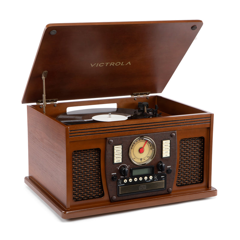 Vintage style meets modern versatility in this expanded 8-in-1 music center. The Victrola Navigator lets you listen your way: spin vinyl, play CDs and cassettes, tune in AM/FM radio, or stream wirelessly from your phone. It also includes Bluetooth output, so you can send audio to your favorite external Bluetooth speakers for a bigger, room-filling sound.