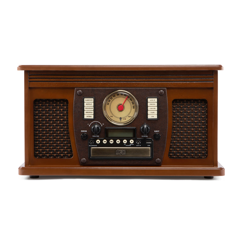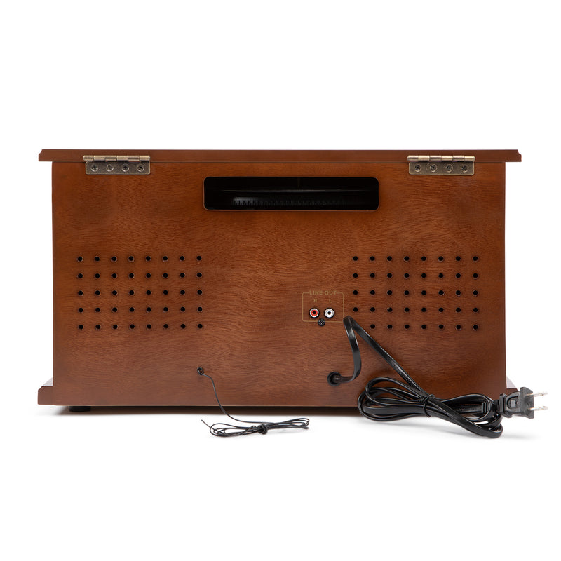 Thoughtfully designed with real wood construction, it offers a warm, authentic aesthetic that fits seamlessly into any space. Built-in stereo speakers deliver rich, balanced sound, while USB and aux inputs, a headphone jack, and RCA outputs give you flexible listening options. Every detail, from the tactile feel of the controls to the sturdy craftsmanship, reflects a commitment to quality that ensures lasting performance and countless music memories for years to come.