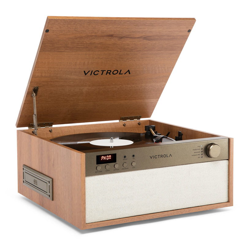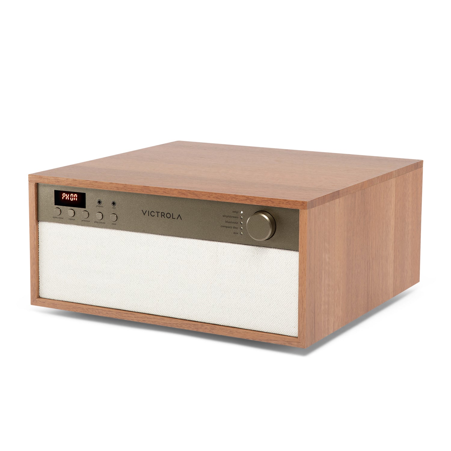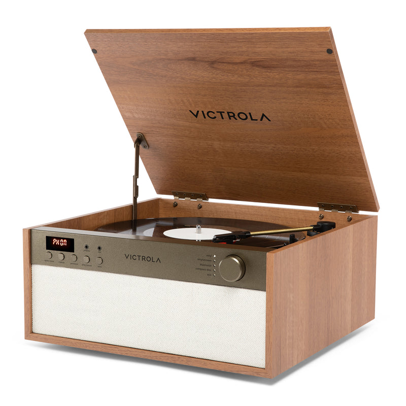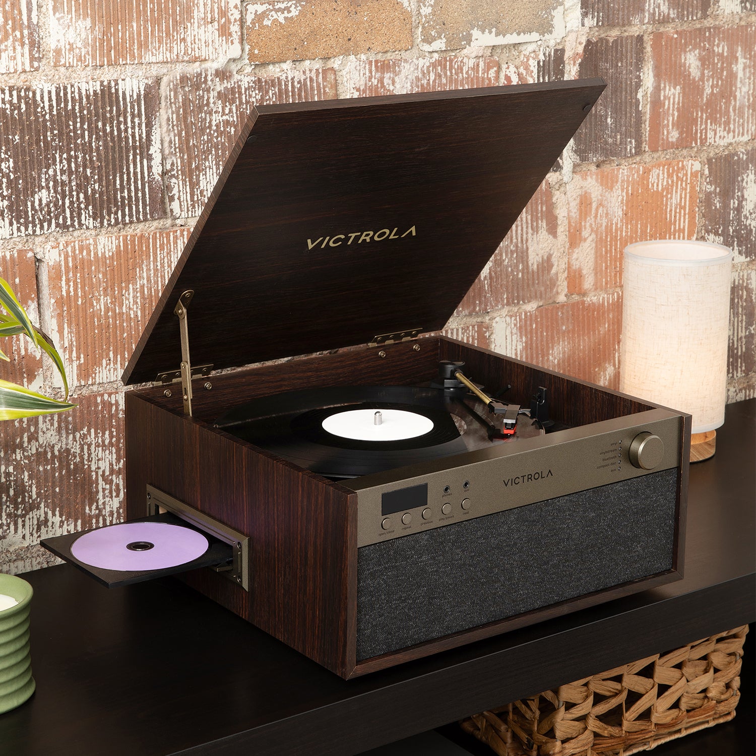 The Victrola Century Essential 5-in-1 Music Center combines timeless mid-century style with modern versatility. Its 3-speed, belt-driven turntable plays all your favorite records through rich built-in stereo speakers, while the integrated CD player lets you rediscover your classic collection. With Bluetooth® connectivity, you can stream music directly from your smart device—or use VINYLSTREAM to wirelessly send your vinyl playback to any Bluetooth-enabled speaker.