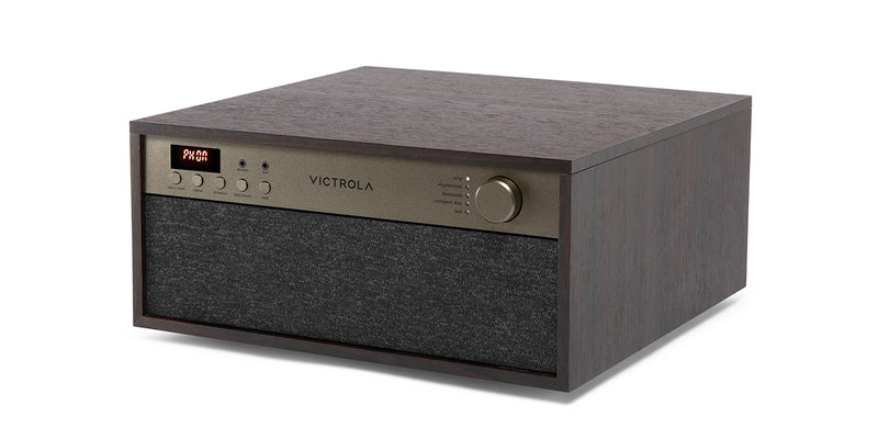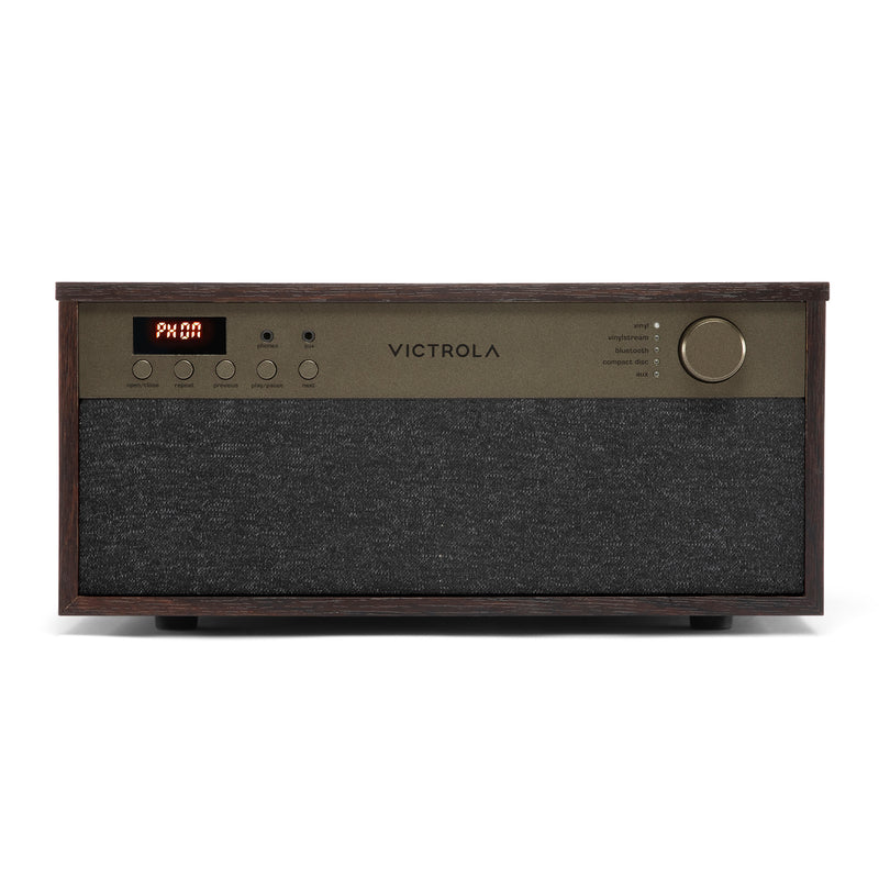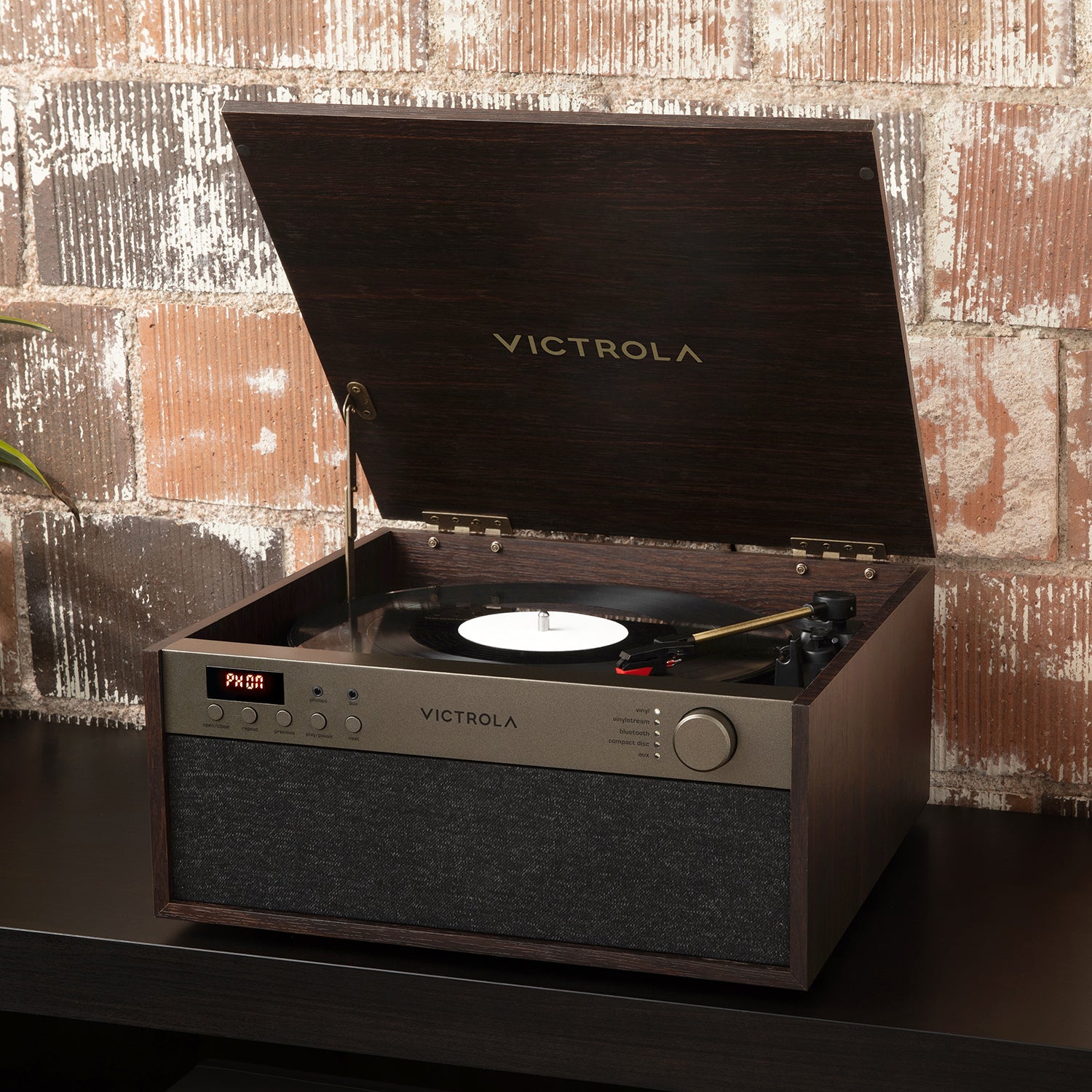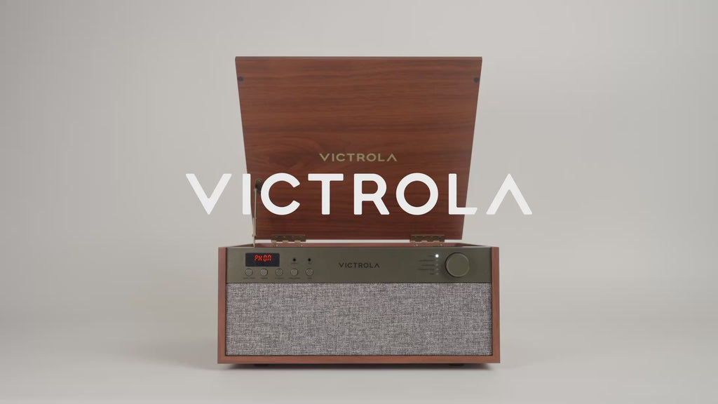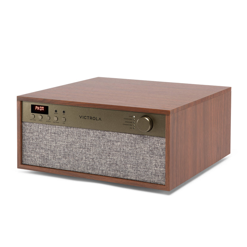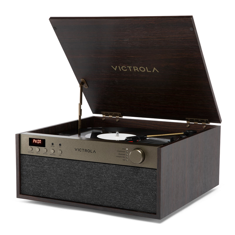 The Victrola Century Essential 5-in-1 Music Center combines timeless mid-century style with modern versatility. Its 3-speed, belt-driven turntable plays all your favorite records through rich built-in stereo speakers, while the integrated CD player lets you rediscover your classic collection. With Bluetooth® connectivity, you can stream music directly from your smart device—or use VINYLSTREAM to wirelessly send your vinyl playback to any Bluetooth-enabled speaker.