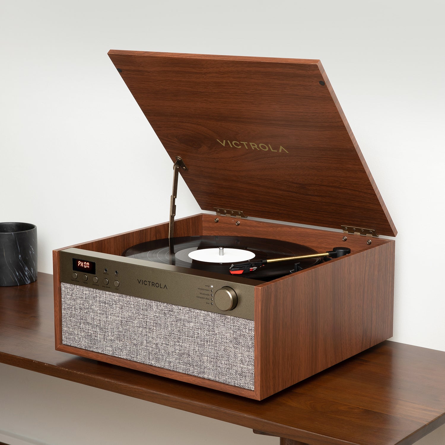 A stylish all-in-one music center that combines mid-century charm with modern versatility for the essential listening experience.