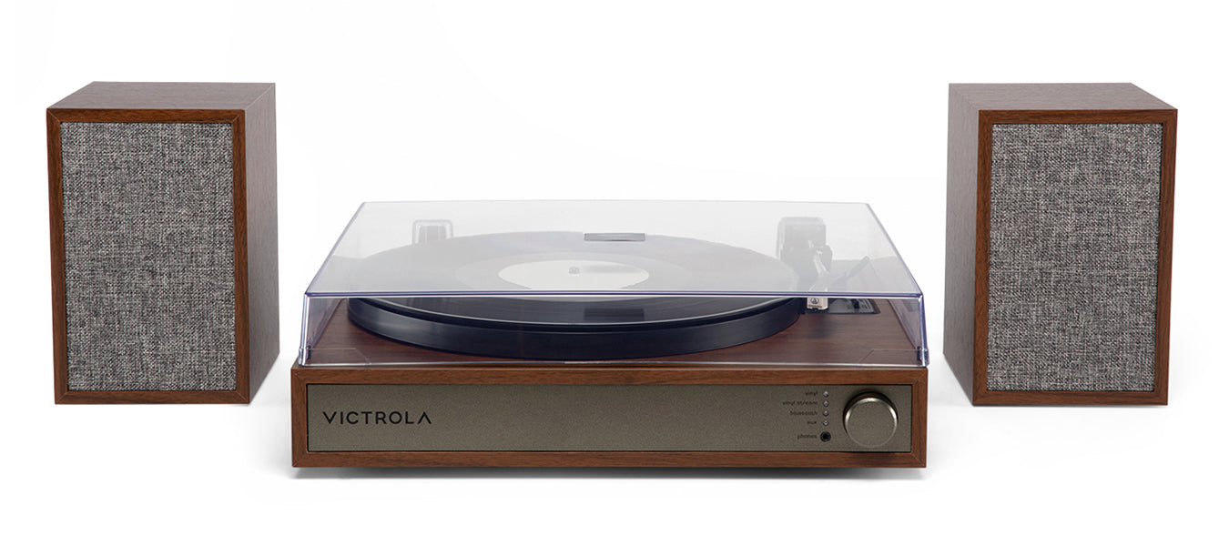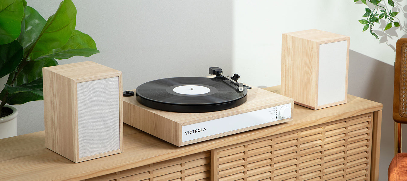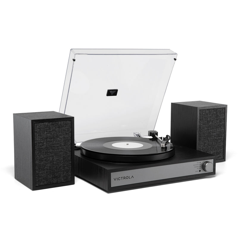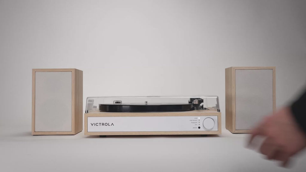 The Victrola Harmony turntable system blends classic mid-century design with premium stereo sound for a rich, immersive listening experience. Featuring a full-size, belt-driven turntable and matching stereo bookshelf speakers, the Harmony system delivers warm, detailed vinyl playback with deep bass and crisp highs.
