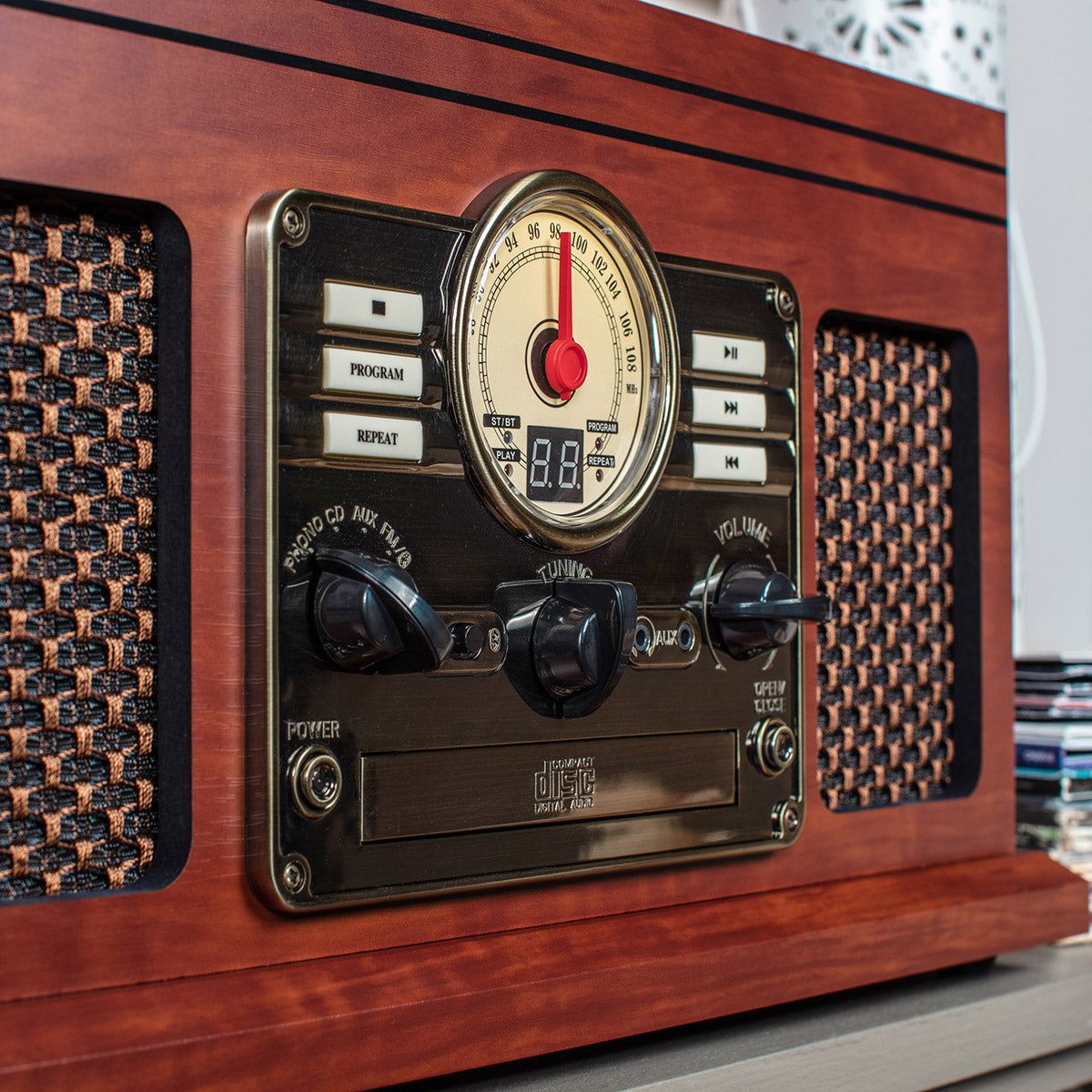 Enjoy vinyl, CDs, cassettes, radio, and Bluetooth streaming in one stylish retro system built for timeless sound.