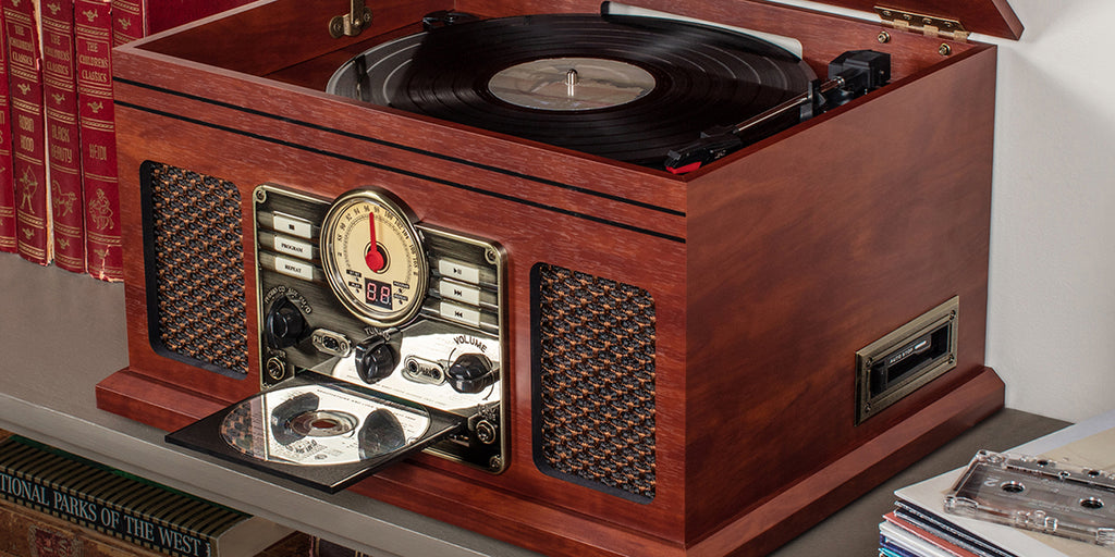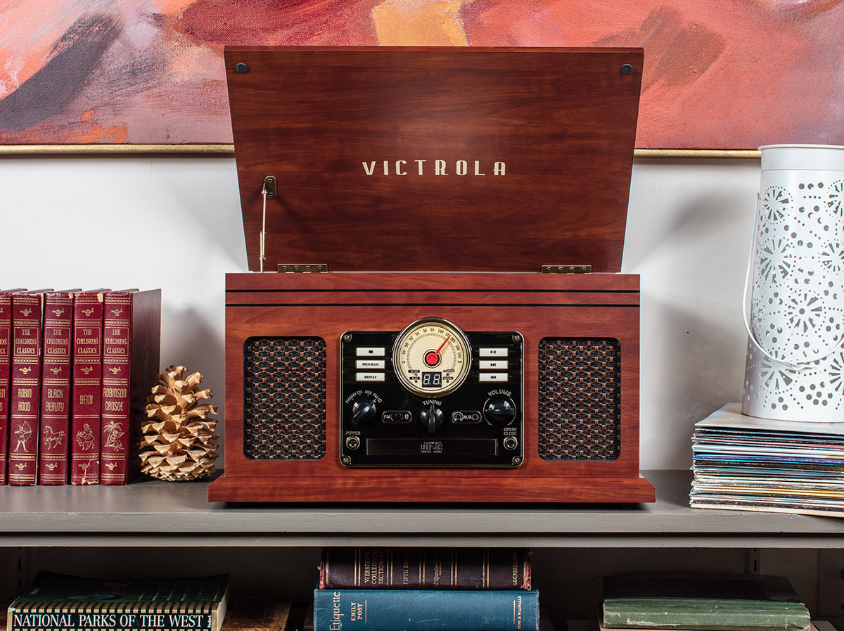 The Victrola Quincy 6-in-1 Record Player packs modern features into a classic package. Old-school rotary dial, and vintage inspired faceplate makes this a perfect addition to any listening space.