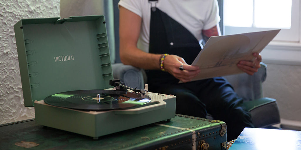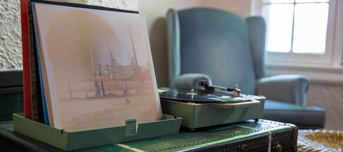 A compact, eco-friendly suitcase player made from recycled materials that delivers powerful bass via a built-in Bluetooth speaker and bass radiator, while letting you spin your favorite vinyl and stream wirelessly.