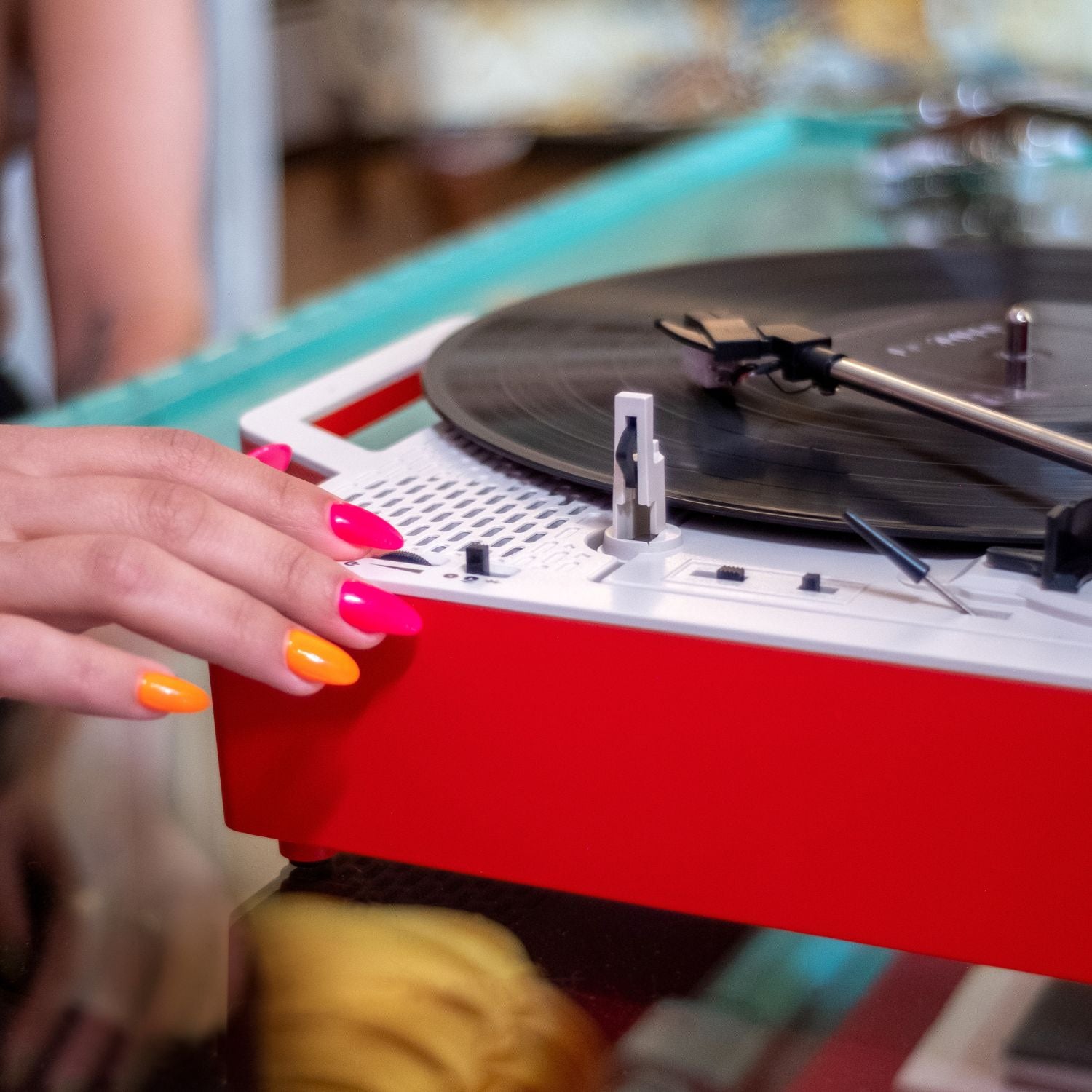 The Re-Spin is the classic 'suitcase' record player reimagined for today's vinyl fans. Made from 25% recycled plastic and featuring a built-in custom-tuned Bluetooth speaker and bass radiator enclosure, the Re-Spin is the best-sounding turntable in its class, with 3x the bass of a standard suitcase record player.
