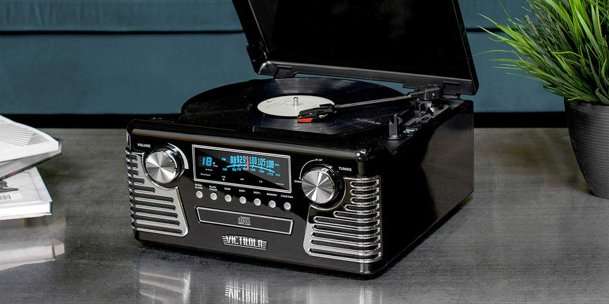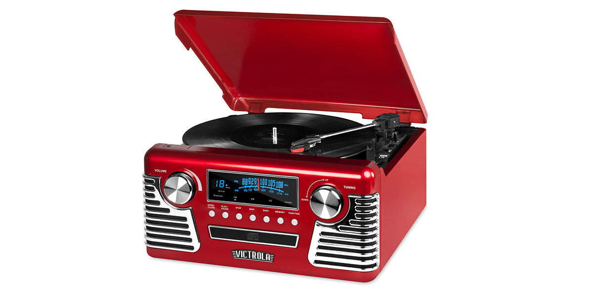 A vintage-inspired turntable that pairs classic style with modern convenience, featuring 3-speed playback, Bluetooth streaming, built-in stereo speakers, a CD player, and AM/FM radio.