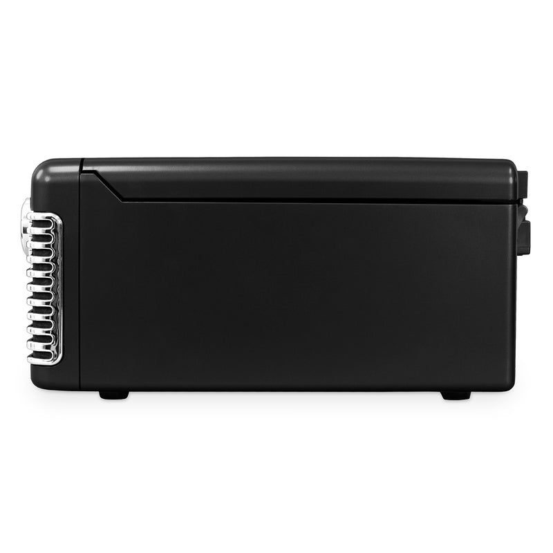You also get a built-in CD player, full stereo speakers, and an AM/FM radio with a glowing backlit tuner. A classic 50s style faceplate gives it personality, and the 3.5 mm aux-in plus headphone jack keep all your non-Bluetooth devices in the mix.